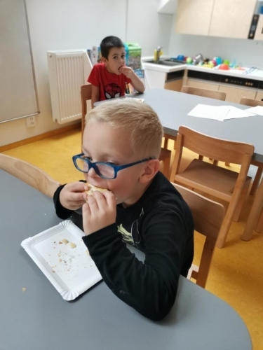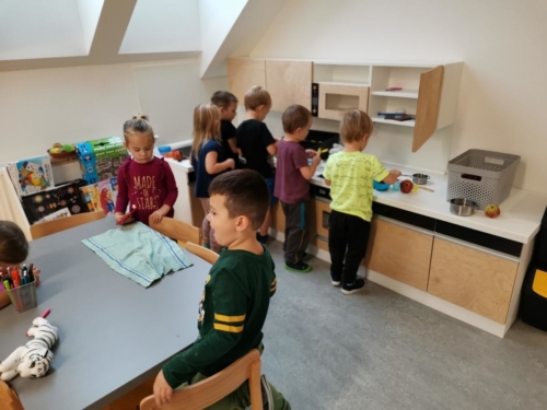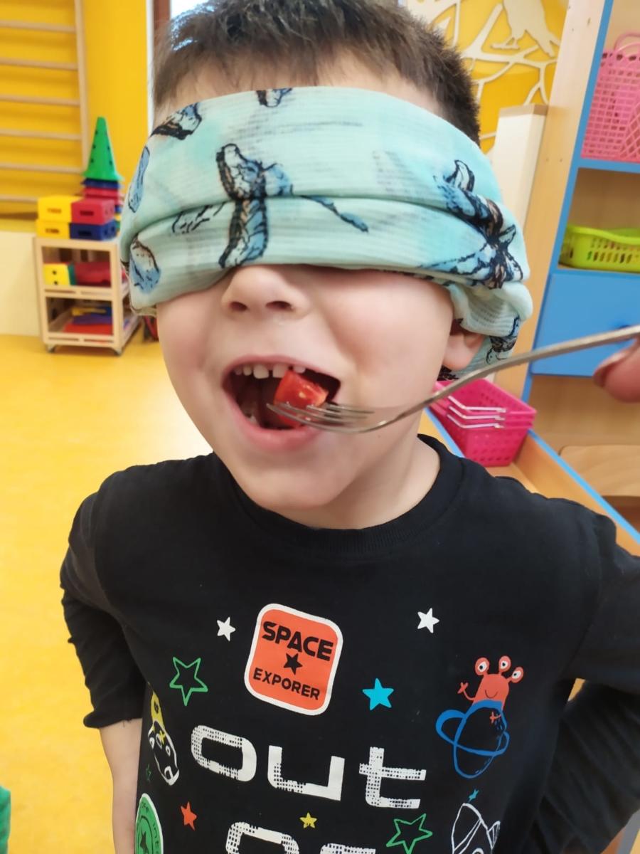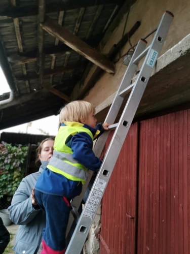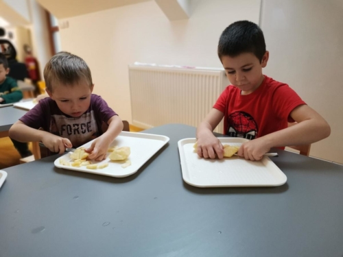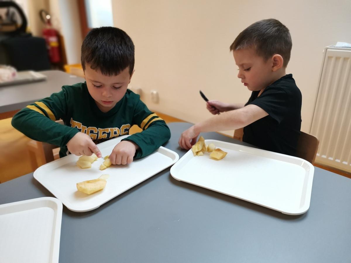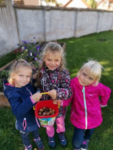V rámci tohoto tématu jsme poznávali ovoce a zeleninu všemi smysly - hmatem, chutí, čichem i zrakem. Učili jsme se, jak můžeme všechny tyto potraviny využít v kuchyni, upekli jsme si štrůdl a usušili výborné křížaly. Byli jsme se podívat, jak vše skladujeme - dokonce jsme se odvážili i do sklepa! A naučili se, jak vylézt na žebřík, abychom mohli sbírat i ovoce ze stromu.