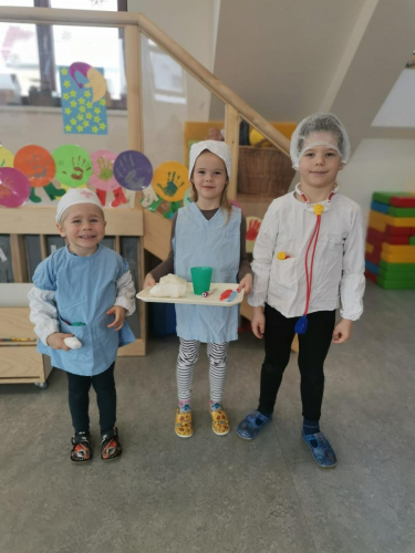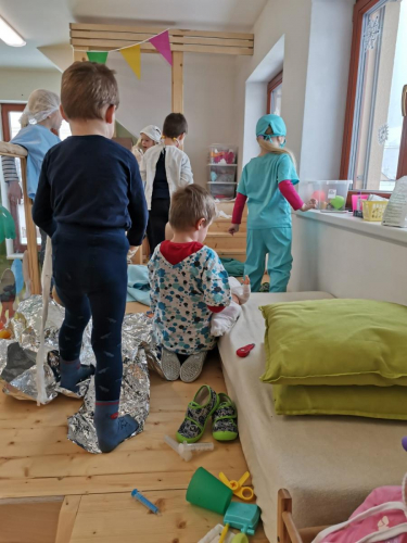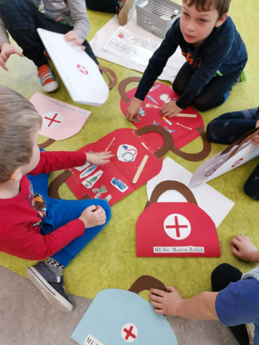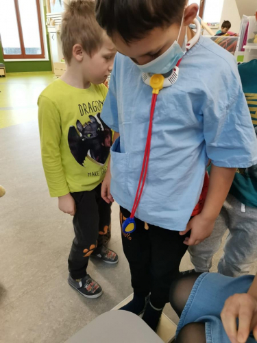 V tomto tématu jsme vytvářeli a učili se zdravé životní návyky a zdraví životní styl. Prohlíželi encyklopedii lidského těla a učili se základní stavbu těla. Vytvořili jsme si čekárnu, ordinaci a navštívili zubaře i doktora. Doktor nám změřil zrak, sluch, tlak, hmotnost a výšku. Zubař nás naučil, jak si správně čistit zuby a spočítal nám zuby. Tyto hodnoty sestřička zapisovala do svých papírů a poté jsme udělali průměr všech hodnot. Poté jsme si role vyměnili a zkusili jsme roli doktorů, doktorek, zubařů i veterinářek. Naučili jsme se starat o nemocné, utěšovat, měřit teplotu, vařit čas a dokonce i operovat. Poznáváme základní lékařské nástroje jako je stetoskop, injekce a tonometr. Poté jsme si zahráli i na sanitku a vozili nemocní pacienty do nemocnice pomocí deky.