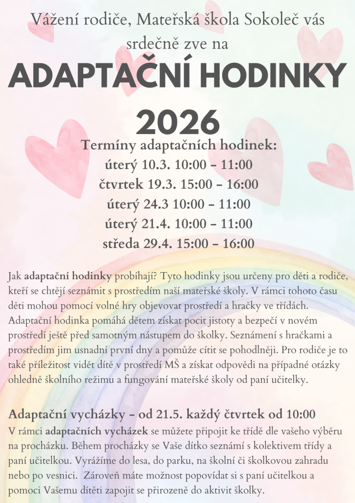 Dne 5. 5. 2025 proběhne zápis do Mateřské školy Sokoleč od 15.00 – 17.00 hodin. Náhradní termín dohodněte telefonicky v MŠ.